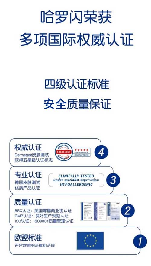 獲得Dermatest認(rèn)證,意味著哈羅閃產(chǎn)品從源頭把控,研發(fā)生產(chǎn)出對寶寶皮膚溫和無刺激,給予寶寶皮膚更為嚴(yán)謹(jǐn)、安全的呵護(hù)。