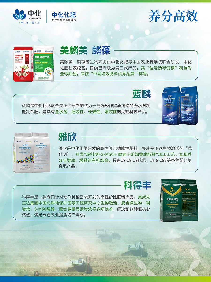 美麟美、麟葆等生物磷肥由中化化肥與中國農(nóng)業(yè)科學(xué)院聯(lián)合研發(fā),中化化肥獨(dú)家經(jīng)營,目前已升級為第三代產(chǎn)品,其“信號誘導(dǎo)促根”科技為全球獨(dú)創(chuàng),榮獲“中國增效肥料優(yōu)秀品牌“稱號藍(lán)麟是中化化肥聯(lián)合先正達(dá)研制的致力于高端經(jīng)作提質(zhì)抗逆的全水溶功能復(fù)合肥,是具有全水溶、速效性、長效性、增效性的尖端科技產(chǎn)品。