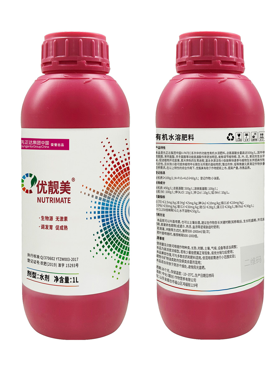 優(yōu)靚美是先正達(dá)集團(tuán)中國X-PATec系列中的功能性有機(jī)水溶肥料??偘被岷扛哌_(dá)500g/L,能夠調(diào)節(jié)植物根、莖、葉、花、果實(shí)的生長平衡,促進(jìn)植物開花座果、膨大轉(zhuǎn)色的生育進(jìn)程;提高作物抗逆性,滿足作物多重營養(yǎng)需求。有助于作物提前上市,提高產(chǎn)量,改善品質(zhì)。