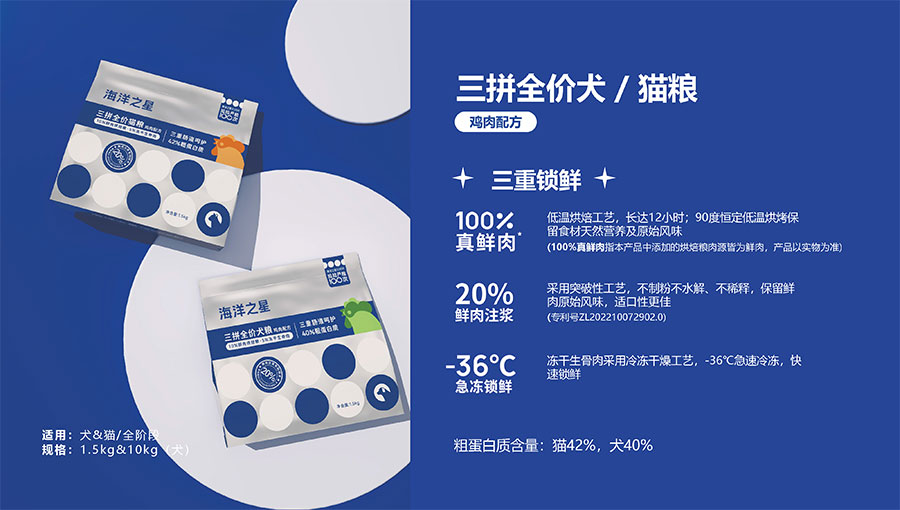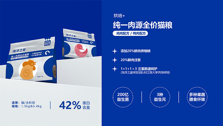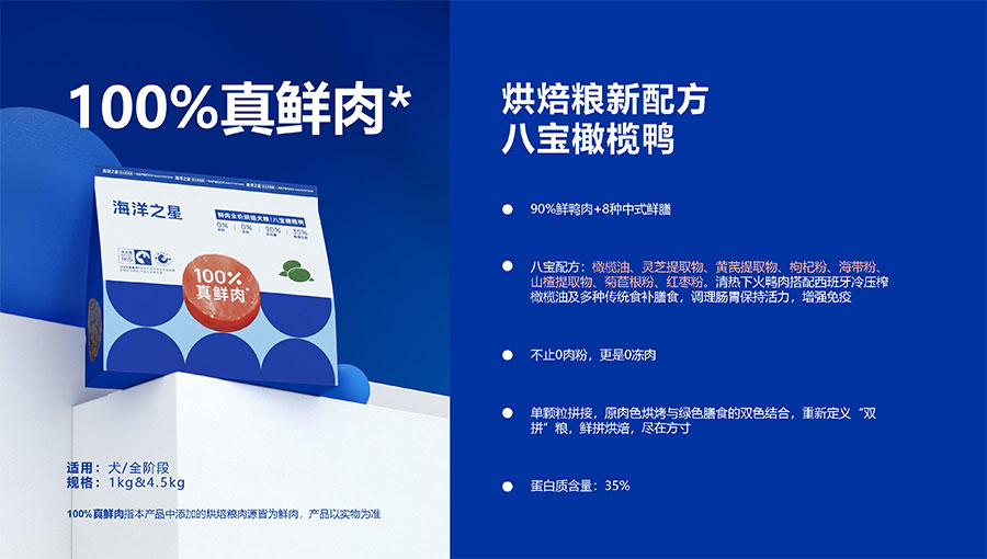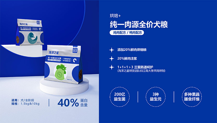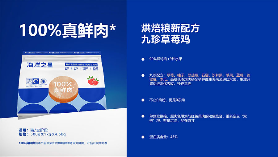 隨著營養(yǎng)消費逐步升級,海洋之星品牌產(chǎn)品線延展至多肉源、多品類,并正式布局烘焙糧市場,以“100%真鮮肉*”重新定義高端烘焙糧品類,為寵主和愛寵提供高品質(zhì)的寵物主糧產(chǎn)品。
