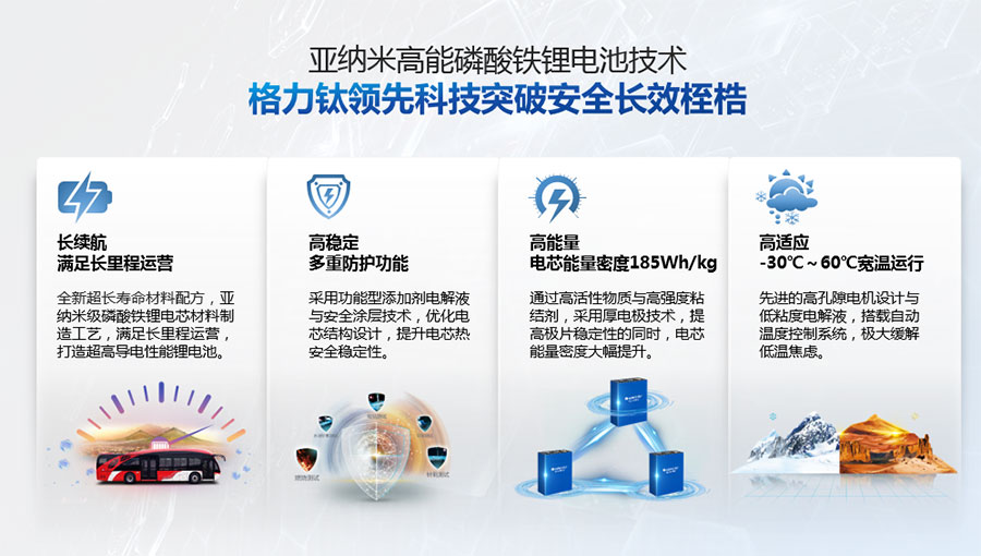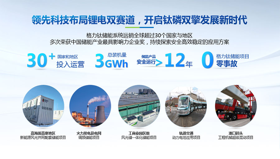 以完善的研發(fā)體系,公司加快技術(shù)創(chuàng)新與產(chǎn)業(yè)升級的步伐。公司研發(fā)的格力鈦電池安全性長期領(lǐng)跑行業(yè),憑借具有高安全、大倍率、快充放、耐寬溫、長壽命等特性,被選為“國家制造業(yè)單項(xiàng)冠軍產(chǎn)品”,廣泛應(yīng)用于新能源汽車以及工商業(yè)園區(qū)、通訊基站、電網(wǎng)調(diào)頻、軌道交通、風(fēng)光消納、船舶岸電、家庭住宅、軍事科研等儲能領(lǐng)域,具有廣闊的市場前景和應(yīng)用價值。目前,格力鈦儲能產(chǎn)品已在丹麥、瑞士、芬蘭等全球30多個國家和地區(qū)使用,新能源汽車產(chǎn)品在北京、杭州、武漢、成都、青島、哈爾濱、包頭、??诘热?40多座城市運(yùn)營,12年全球零電池事故安全運(yùn)行。