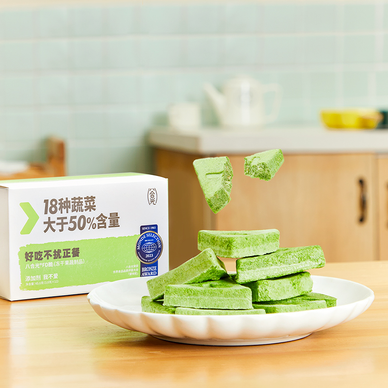 隨著育兒觀念、消費(fèi)意識(shí)的轉(zhuǎn)變,新生代父母在兒童零食上,不僅看重天然健康,還要對(duì)孩子身體的成長(zhǎng)發(fā)育有益。為了滿足這屆父母對(duì)兒童零食的新需求,2022年底,八合光兒童零食品牌率先推出了一款含有“18種蔬菜”的蔬菜凍干機(jī)能零食——八合光FD脆。