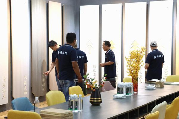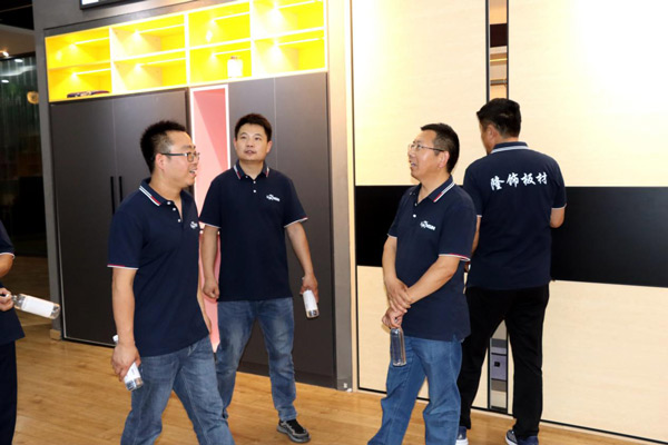 在隆飾精品展廳中,大家興趣十足,依次欣賞著不同系列板材產品所打造的定制家具效果,讓大家更直觀地了解隆飾板材,增加經營信心,讓經銷商對隆飾產品更加具有信心!