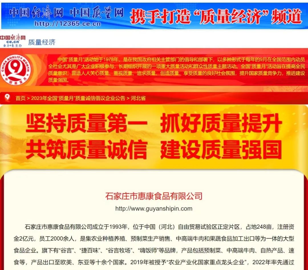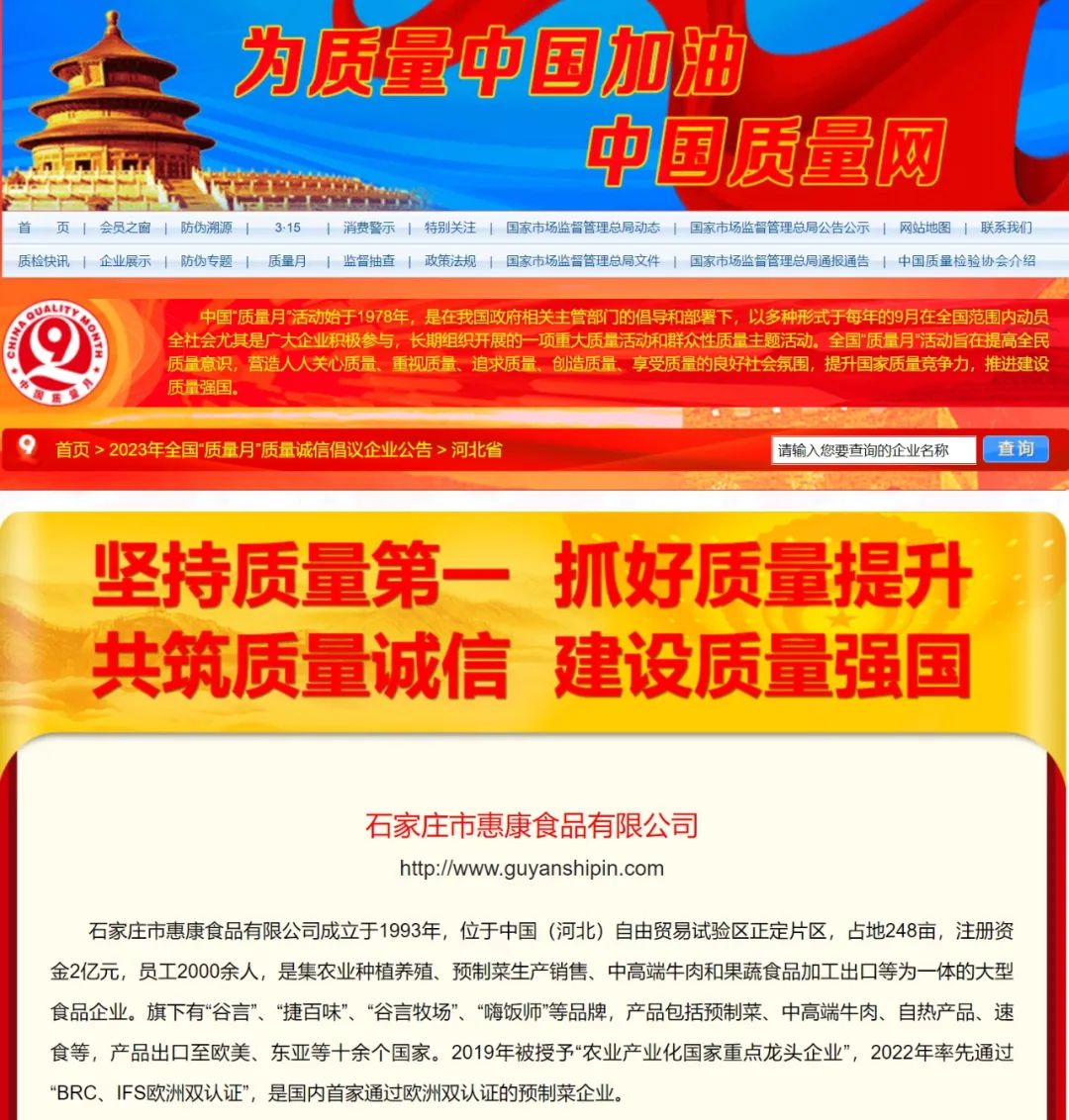 近日,石家莊市惠康食品有限公司再傳捷報(bào),在中國(guó)質(zhì)量檢驗(yàn)協(xié)會(huì)組織開(kāi)展的2023年全國(guó)“質(zhì)量月”專(zhuān)題活動(dòng)中,深耕食品制造行業(yè)30年的惠康食品,憑借過(guò)硬的產(chǎn)品質(zhì)量再次被授予“全國(guó)質(zhì)量誠(chéng)信標(biāo)桿企業(yè)”?!吨袊?guó)質(zhì)量網(wǎng)》、《中國(guó)經(jīng)濟(jì)網(wǎng)》、《中國(guó)產(chǎn)品質(zhì)量信譽(yù)網(wǎng)》等媒體予以集中展示宣傳。這是中國(guó)質(zhì)量檢驗(yàn)協(xié)會(huì)、社會(huì)各界及消費(fèi)者對(duì)惠康食品產(chǎn)品與服務(wù)質(zhì)量的高度認(rèn)可。