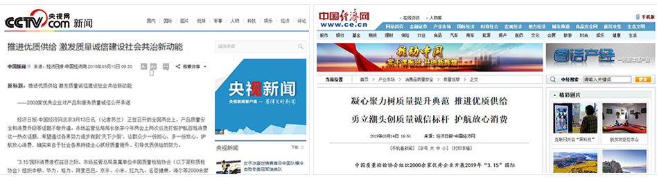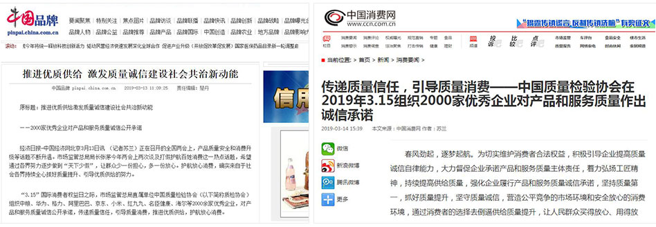 •中國(guó)消費(fèi)網(wǎng)《傳遞質(zhì)量信任,引導(dǎo)質(zhì)量消費(fèi)——中國(guó)質(zhì)量檢驗(yàn)協(xié)會(huì)在2019年3.15組織2000家優(yōu)秀企業(yè)對(duì)產(chǎn)品和服務(wù)質(zhì)量作出誠信承諾》